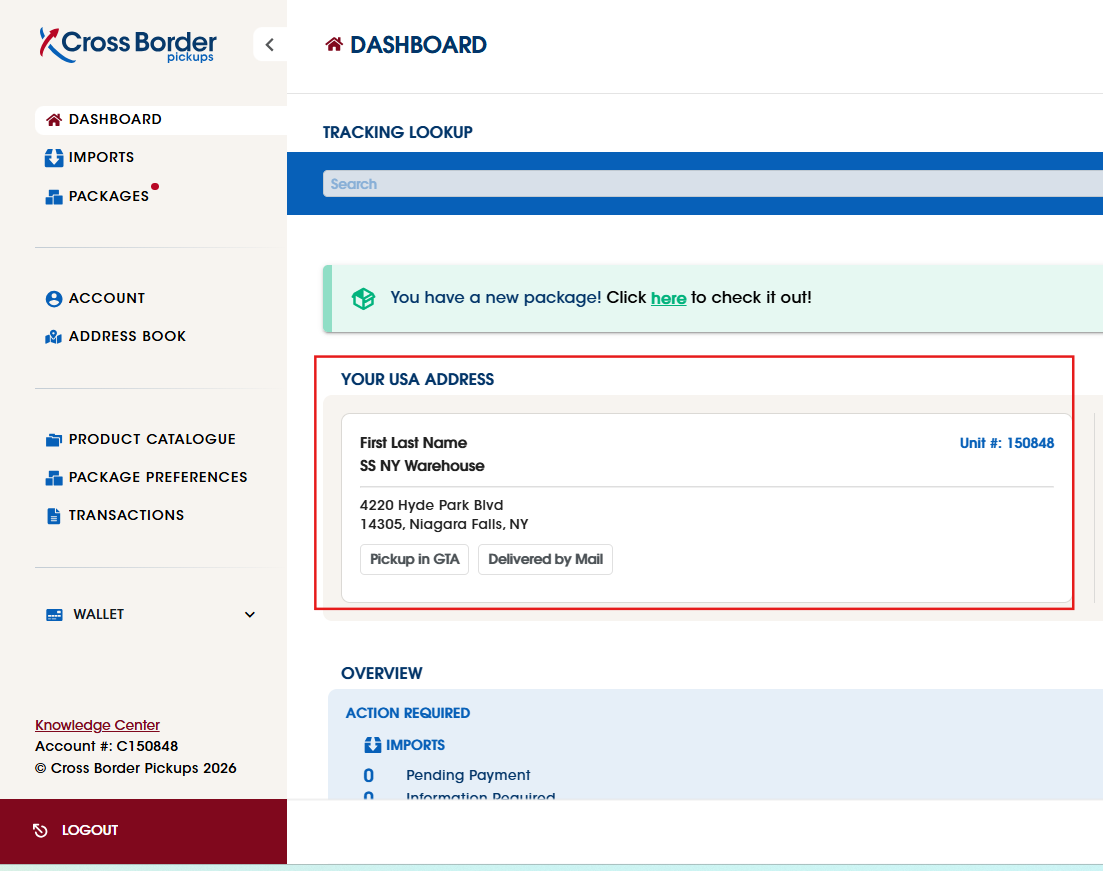 We will provide you with your own unique unit number at our US facility when you sign up. This address will be available on your Dashboard when logged into your Cross Border Pickups customer portal. Please use this address when placing orders with US retailers. Please ensure that the name and unit number are provided when placing the order.