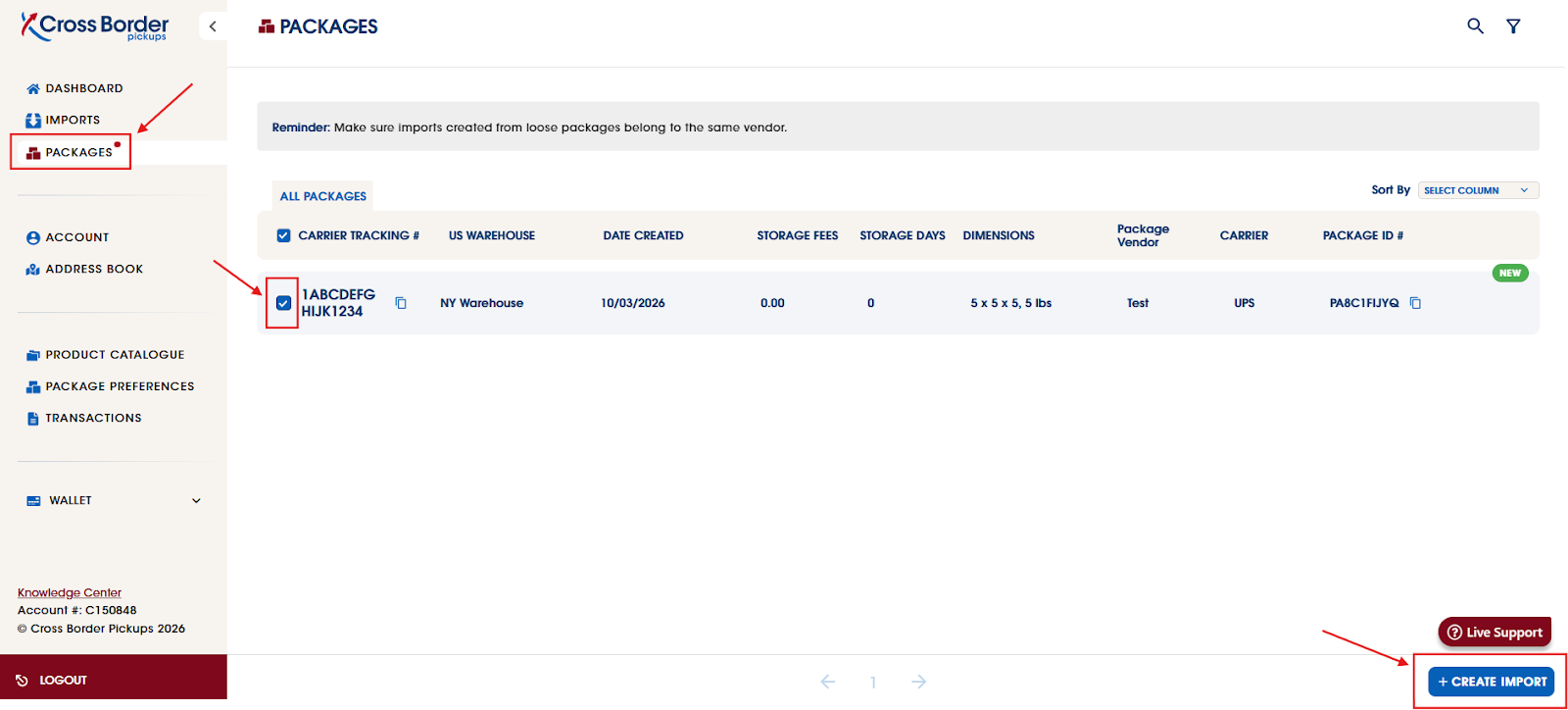 * For multiple packages from the same retailer/order, please select all packages first and then proceed to click on CREATE IMPORT.