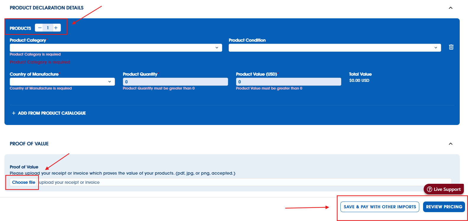 When all the product information has been declared, you have the option to upload the proof of value/invoice; this is an optional feature and is not required.