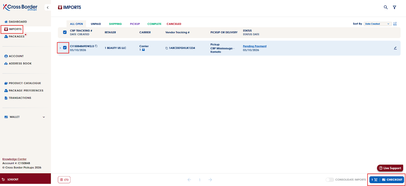 If you choose to save & pay with other imports, the import will be available under the Imports tab with the status reflecting pending payment. When you are ready to create the order, you can select all the pending payment imports and click on Checkout to create the order.
