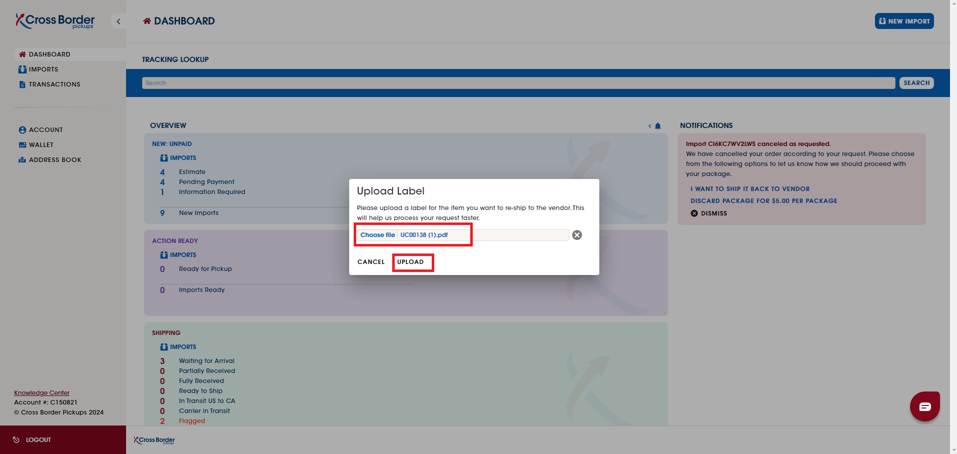 6. On the pop-up that will appear, click on Choose File, select your shipping label file provided by the vendor. Click on Upload.